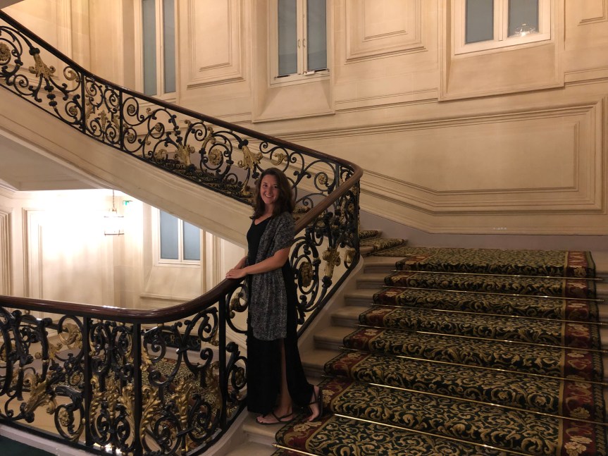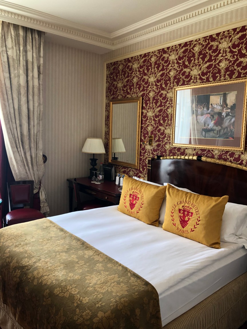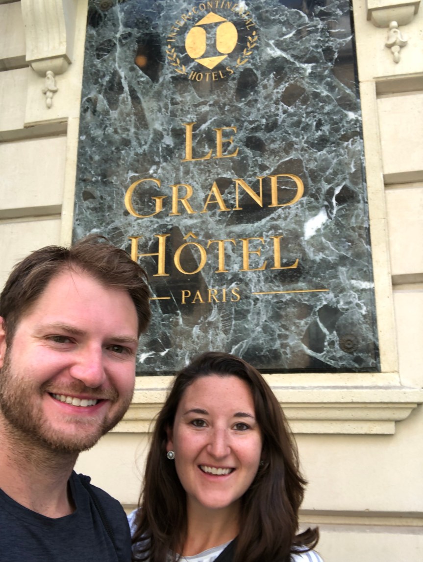 Up until this point, we had been staying in only Airbnb’s, but we had our first hotel night of the trip booked in Paris, and it was an incredible one! We had a free night to use with IHG rewards and were able to use it to stay at the fabulous, 5-star Intercontinental Paris Le Grand Hotel! We have stayed at several really nice hotels in the past using credit card rewards, including the iconic Plaza Hotel in New York City, the Copley Plaza hotel in Boston, and the castle-like Le Chateau Frontenac hotel in Quebec City, Canada. But, I have to say that this hotel truly rivaled all of those for the top spot. It was absolutely, over-the-top, amazing, and we felt like royalty staying there. (It’s always especially interesting, too, when we roll in with our backpacker style, after walking and taking public transportation, to a 5 star hotel, haha!)