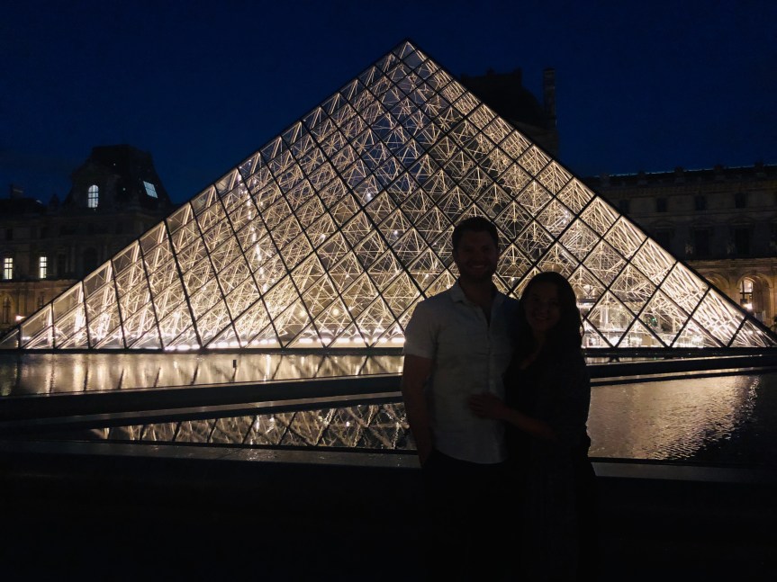 We did break away from the hotel for a little while to have dinner and then take a stroll around that part of town, despite it being a little rainy outside. We were actually so surprised to see rain, because we hadn’t had ANY rain at all during the first month of our trip! But I’m so glad that we did make it out that night, because we walked over to the Louvre and got to see the beautiful Louvre pyramids lit up at night, as well as catch our first glimpse of the Eiffel Tower from afar, including seeing it sparkle and light up during the lights show at 11pm! There was definitely magic in the air, and it felt quite romantic, walking around Paris that first night!
