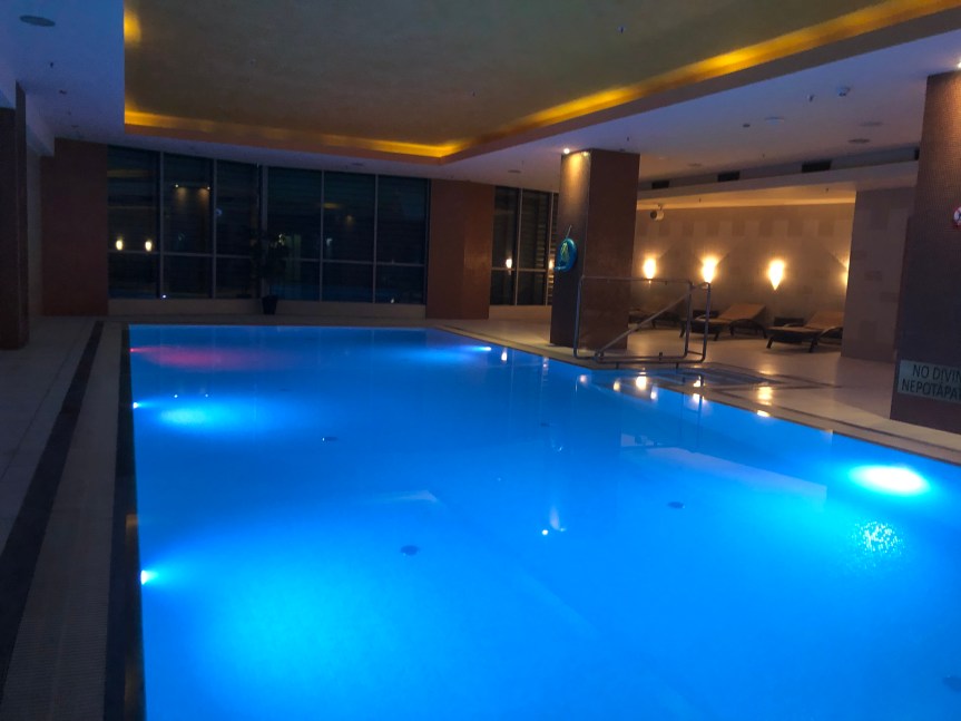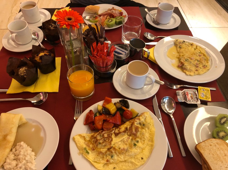 We stayed at a nice hotel in Bratislava and got to take advantage of the hotel gym, sauna, and pool! We spent a significant amount of time lounging around the hotel, catching up on sleep as well as some work for the websites. We also took advantage of free hotel breakfast, as well as free welcome drinks (champagne) on the patio one day! We love when we have free hotel perks using our rewards status (in this case with my Hilton Honors card).