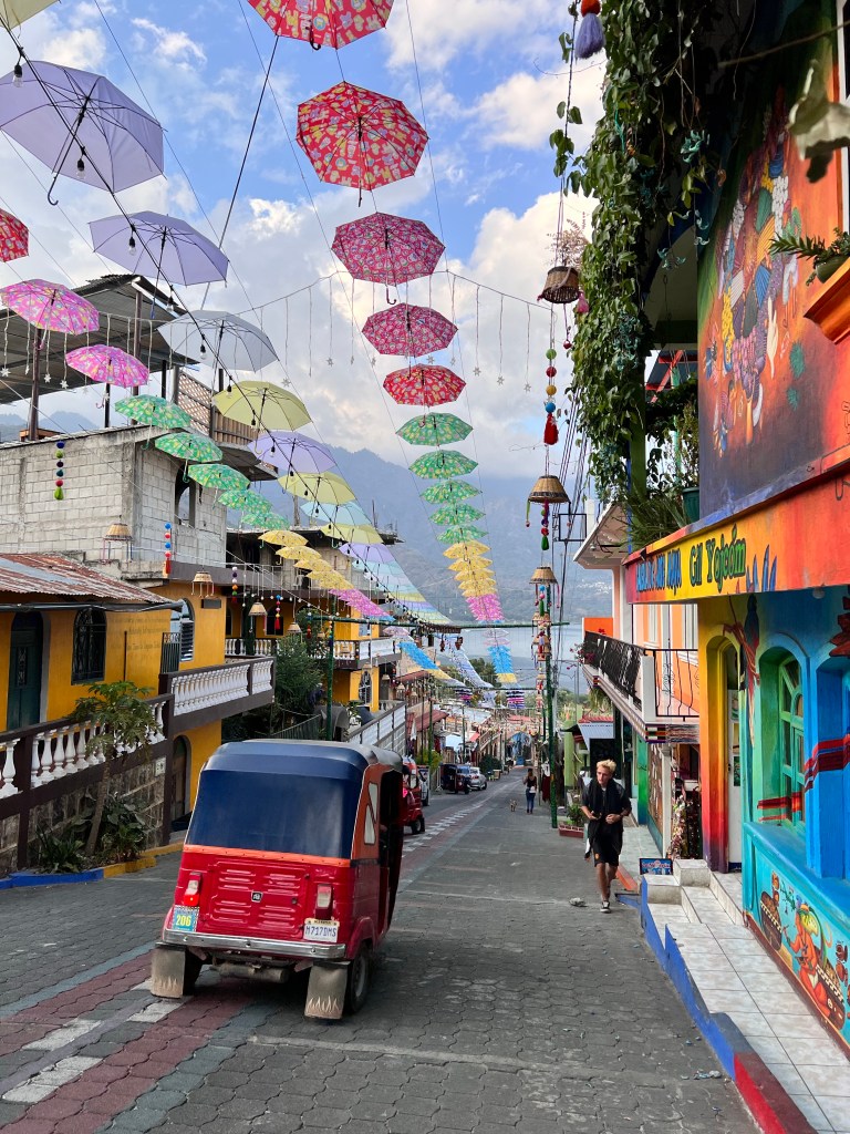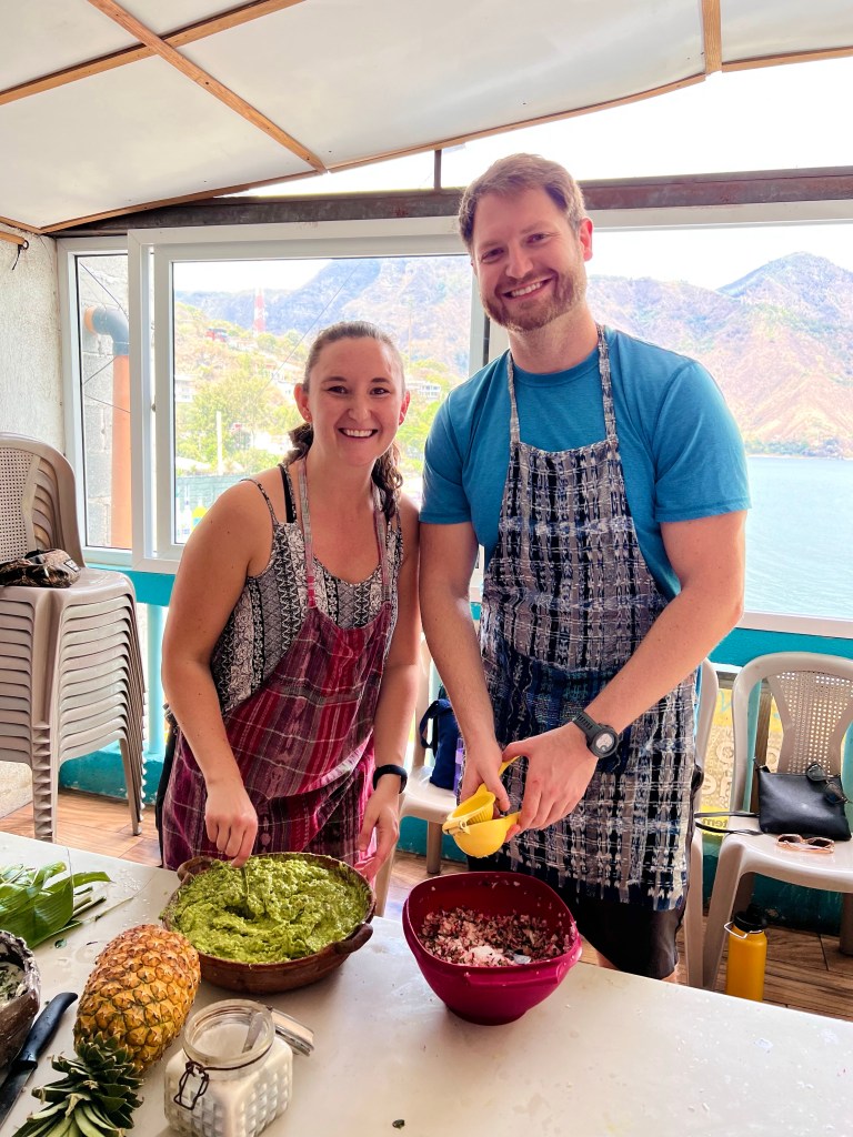 One thing we learned about Guatemala is that it’s not very easy to get around, and typically it involves long bus or taxi rides, over windy mountain roads. We later learned it’s similar in Costa Rica. Our next stop after Antigua involved taking a bus to the town of Panajachel at Lake Atitlán. From there, we took a boat taxi across the lake to the village of San Juan La Laguna. We absolutely LOVED this little village and the lake itself. We rented the cutest bungalow, and each day we explored a new village by taking a boat taxi across the lake. At the recommendation of a good friend whose mom goes to Guatemala regularly for mission trips, we took a cooking class in the village of San Pedro La Laguna with their local friend, Anita. This was an amazing experience, and we highly, highly recommend if you go to Lake Atitlan to take Anita’s Mayan Kitchen Cooking Lesson!