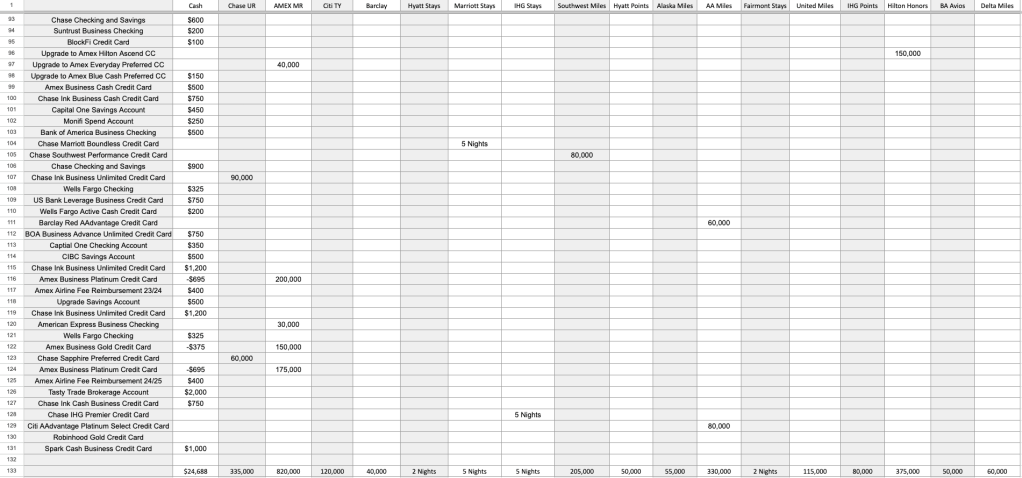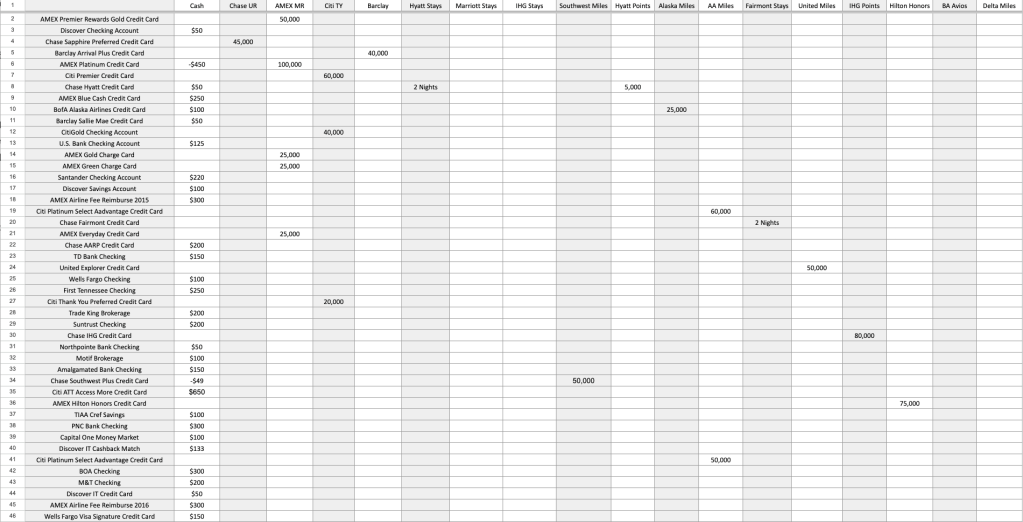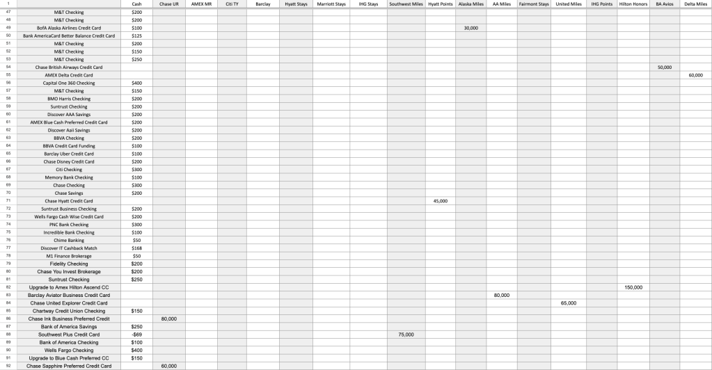 Alright, let’s get into the spreadsheet and numbers. These are screenshots of a spreadsheet I made tracking all of my credit card, bank account, and brokerage account bonuses over the past 10 years: