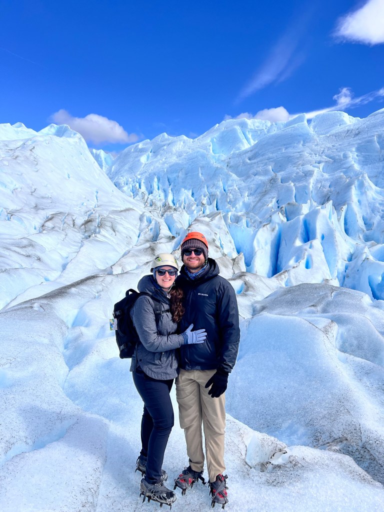 We stayed three nights in El Calafate in an Airbnb. The main activity we wanted to do while in this area was see the Perito Moreno Glacier which was about an hour and a half away. We decided to do an ice trekking tour with Hielo & Aventura. We’d done glacier trekking before but our friends had not. But every glacier is so unique and we can’t get enough of them so it was an incredible experience for all of us! The tour involved taking a ferry, then a guided trek where they provided the crampons/ice cleats for us. We also got to drink glacier water and have some liquor poured over glacier ice, ha! After our guided tour, we returned to where you can view the glacier from these boardwalks/observation decks. This gave us a different perspective of the glacier from above, which was really beautiful! Did I mention we can’t get enough of glaciers, ha!