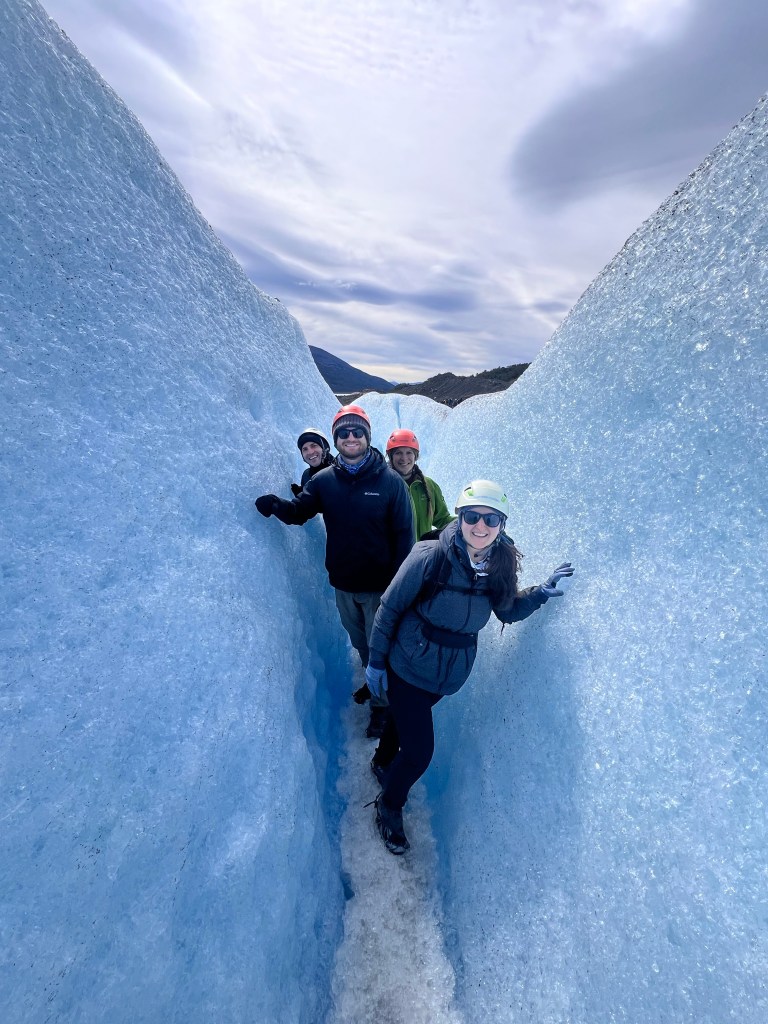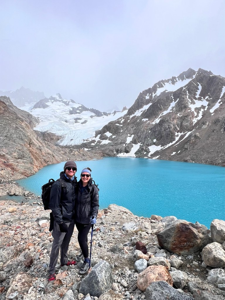 We spent four nights in El Chalten in our little bungalow. We did the Mt. Fitz Roy trail (~14.5 miles) on our first full day. This was a really beautiful hike with awesome views. Unfortunately it was foggy and obscured some of our views on the first day. The next day we hiked to Laguna Torre (~12 miles) which was another beautiful hike, but we continued to have some fog and rain that day. On our last full day, we drove to see a big waterfall (Chorrillo del Salto). I think Laura and Justin also set out on another shorter hike/trail run this day, but they encountered a downpour and we weren’t sad we didn’t join them haha. Besides hiking, we also enjoyed some good food in El Chalten, and had some downtime relaxing at the bungalow!