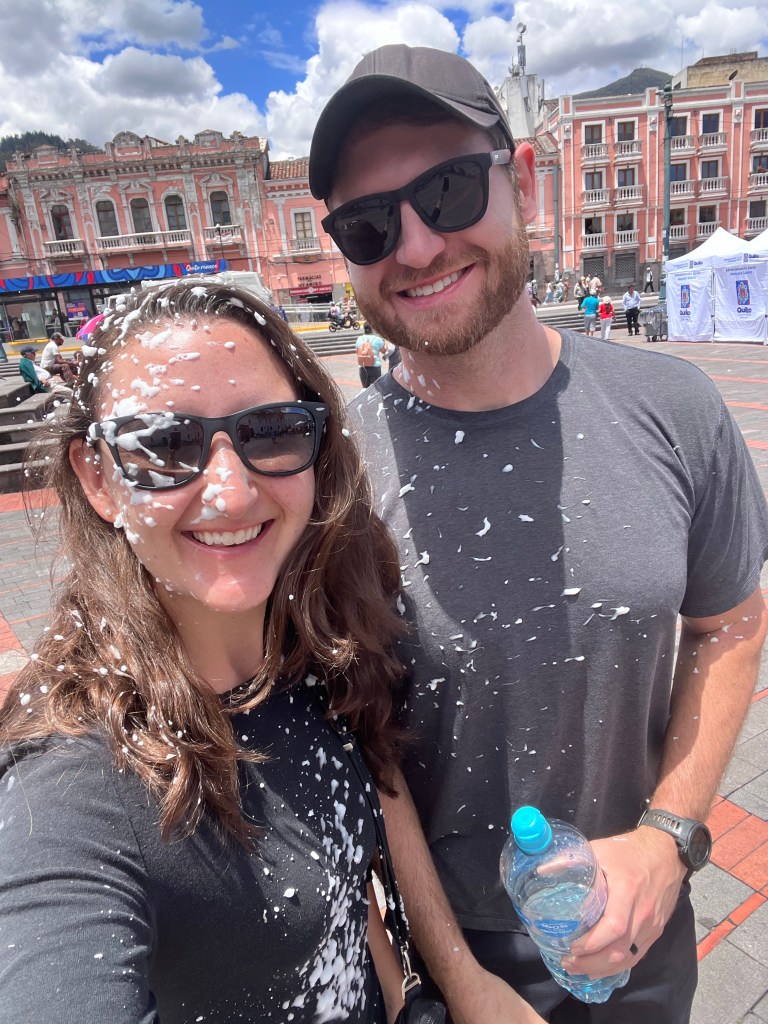 After a few days in the cloud forest, we headed back to Quito for a couple days in the city before the end of our trip! We happened to be there during Latin America’s “Carnaval” which was neat to see. We saw some of the festival activities going on while we were in the city. We got sprayed with lots of silly string haha, plus saw singing and dancing and celebrating. We also took a Free Walking Tour to see the highlights of the city, and enjoyed lots of good food!