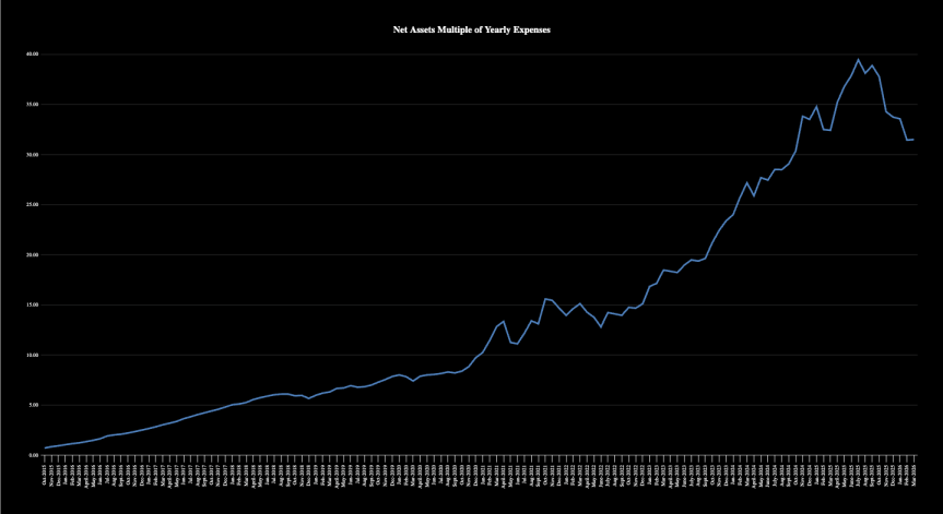 My assets are now equal to approximately 31.5 times my average annual expenses!